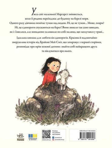 Увесь світ маленької Маргарет змінюється, коли її родина переїжджає до будинку на березі моря. Одного разу дівчинка помічає туман над водою. Ні, це не туман... Може, хмари? Ні, це єдинороги спускаються на берег! Вони зникли так само швидко, як і з’яви- лися, але випадково залишили по собі малюка, що заплутався у траві... Ідеальна книжка для любителів єдинорогів.