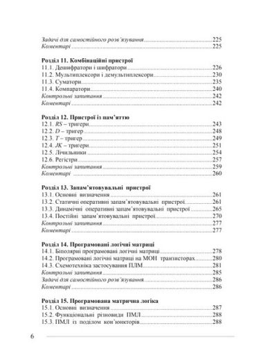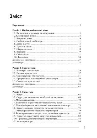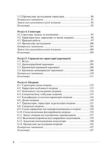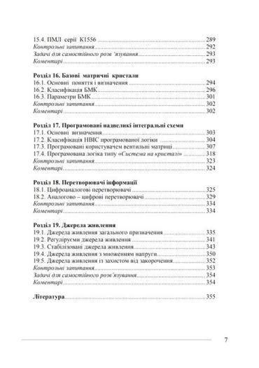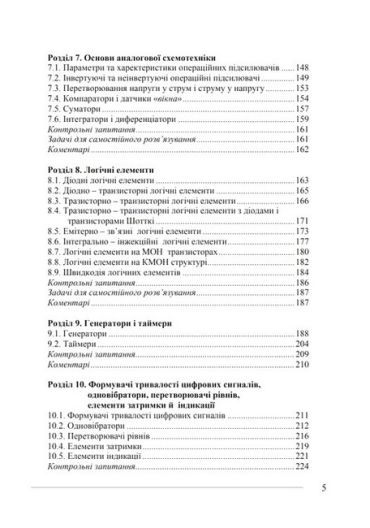 У підручнику розглянуті: напівпровідникові діоди, транзистори, тиристори, симістори, управляєми тиристорні перемикачі та оптрони; логічні елементи різного призначення, комбінаційні пристрої, елементи з пам’яттю та запам’ятовуючі пристрої; генератори, одновібратори, таймери, формувачі сигналів, перетворювачі рівнів, елементи затримки й індикатори; програмовані логічні матриці, програмована матрична логіка, базові матричні кристали, програмовані надвеликі інтегральні схеми, операційні підсилювачі і на їх основі різні перетворювачі, суматори, інтегратори й диференціатори; розглянута побудова цифроаналогових та аналого-цифрових перетворювачів інформації та джерел живлення різного електронного призначення.