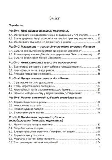 Разом з цим підручник включає всі матеріали, що відповідають типовим робочим програмам з маркетингу, що викладаються в провідних університетах світу та України. В підручнику розглядаються актуальні напрямки розвитку теорії і практики маркетингу, нові сучасні авторські концепції: інноваційний маркетинг, маркетингові ризики, диджитал інструменти в маркетингу, концепція рефлексівного маркетингу, методика структурованого табличного аналізу бізнес-середовища (СТАБС-аналіз), використання штучного інтелекту в маркетингу тощо.