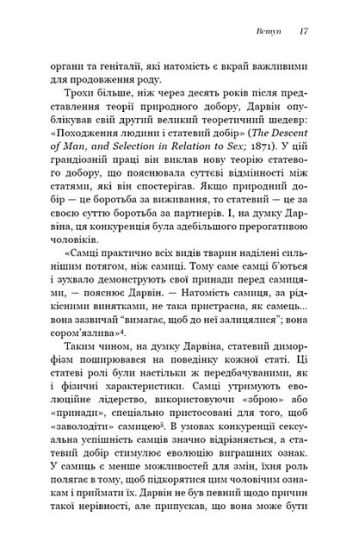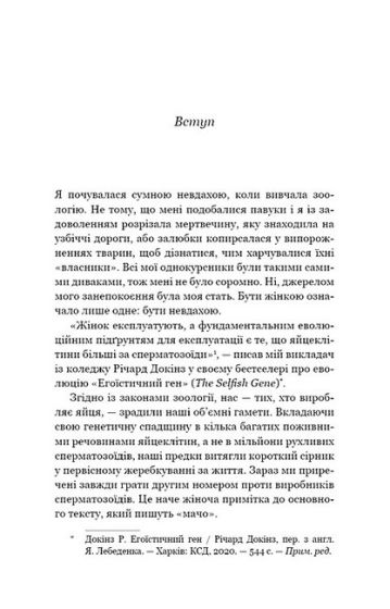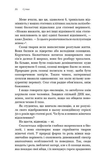 Починаючи з Чарлза Дарвіна, біологи-еволюціоністи були переконані, що у тваринному світі цікавими є насамперед самці — домінуючі, винахідливі й активні, тоді як самиці — нудні, пасивні й віддані. Сучасна дослідниця Люсі Кук розповідає іншу історію. Незалежно від того, вивчає вона одностатеві пари самиць альбатросів, які разом вирощують пташенят, смертоносних сурикатів-матерів чи титанічну боротьбу статей, яку ведуть качки, авторка показує нам нову версію біології тварин, у якій самиці відіграють далеко не другорядну роль, а секс стає одним із чинників еволюції.