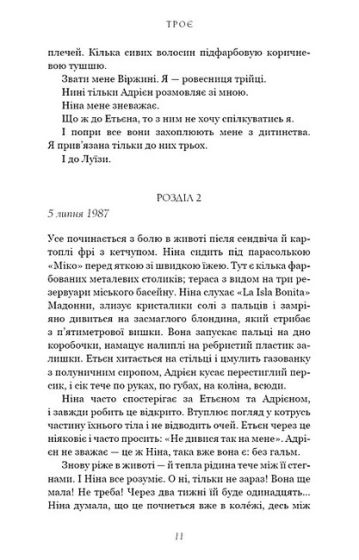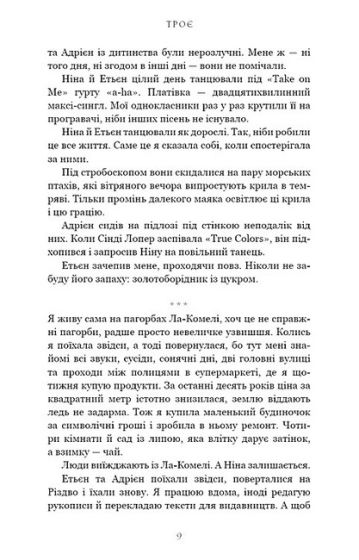 Аматорський музичний гурт «Троє» скидається на юних Курта Кобейна, Боба Ділана та Одрі Гепберн. Вони знайомляться з веління випадку в середній школі, здружуються й поволі второпують, що стають одним цілим, не мислячи життя окремо. Однак життя випробовує і їхню дружбу, і волю кожного з них. Красунчик і ловелас Етьєн, зрісши в розкошах, лише на порозі смерті розуміє, що єдиним скарбом його життя є син. Осиротіла ще до повноліття Ніна, прагне домашнього затишку, утім зазнає наруги, тож розрадою стають коти й собаки із притулку, такі само покинуті й самотні, як і вона. Сором’язливий і мовчкуватий Адрієн реалізується як драматург, проте загальне визнання робить його ще більшим самітником. А хто ж ця таємнича й загадкова Віржині, яка оповідає цю історію шкільних років і юнацтва тих трьох? І чи має вона місце в їхній дружбі? Валері Перрен щемливо окреслює найдражливіші питання становлення юні: ідентичність, сексуальність, дружба, кохання та відданість. І найважливіше з-поміж цього — відвага бути собою.