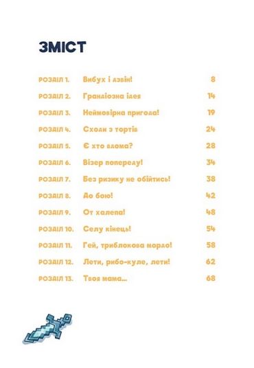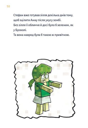 Захоплива пригода для читачів-початківців: короткі розділи, короткі речення, короткі рядки, багато смішних та цікавих малюнків. Супербонуси — класний сертифікат читача і словничок! Не є офіційним продуктом Minecraft. Не схвалено і не пов’язано з Mojang. Пояснення виділених кольором слів ти знайдеш у словничку на сторінці 75.