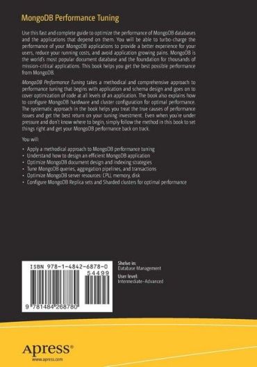 MongoDB Performance Tuning takes a methodical and comprehensive approach to performance tuning that begins with application and schema design and goes on to cover optimization of code at all levels of an application. The book also explains how to configure MongoDB hardware and cluster configuration for optimal performance. The systematic approach in the book helps you treat the true causes of performance issues and get the best return on your tuning investment. Even when you’re under pressure and don’t know where to begin, simply follow the method in this book to set things right and get your MongoDB performance back on track.