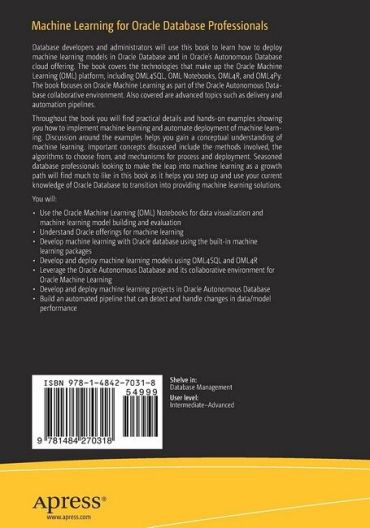 Throughout the book you will find practical details and hand-on examples showing you how to implement machine learning and automate deployment of machine learning. Discussion around the examples helps you gain a conceptual understanding of machine learning. Important concepts discussed include the methods involved, the algorithms to choose from, and mechanisms for process and deployment. Seasoned database professionals looking to make the leap into machine learning as a growth path will find much to like in this book as it helps you step up and use your current knowledge of Oracle Database to transition into providing machine learning solutions.
