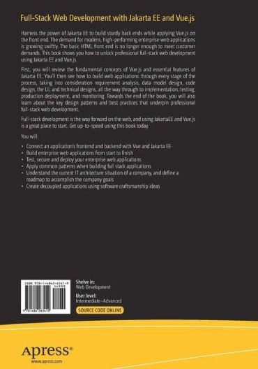 Harness the power of Jakarta EE to build sturdy back ends while applying Vue.js on the front end. The demand for modern, high-performing enterprise web applications is growing swiftly. The basic HTML front end is no longer enough to meet customer demands. This book shows you how to unlock professional full-stack web development using Jakarta EE and Vue.js.