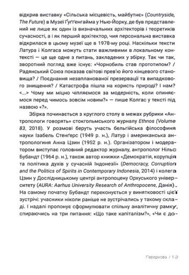 Збірка проблематизує, прояснює та ставить нові питання. Вона починається з круглого столу антропологів, а завершується списком питань від архітектора Колгаса. Укладаючи книжку, я мав на увазі досить розгалужену мережу адресатів з їхніми професійними практиками та практиками співіснування. Архітекторок і архітекторів, мисткинь та мистців, антропологинь та антропологів, філософинь та філософів, а також усіх, хто відчуває цікавість та потребу в обговоренні оптик сьогоднішнього дня, що виходять за межі антропологічного й наважуються ставити питання про майбутнє в добу антропоцену. Сподіваюся, що з виходом збірки нам вдасться навести фокус на вже існуючі практики в зазначених сферах, а також підважити дискурс "модерних людей"».