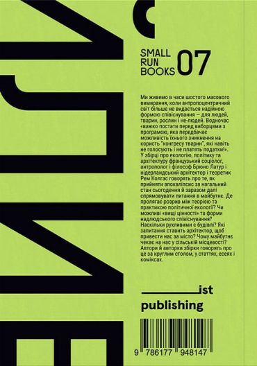 У збірці про екологію, політику та архітектуру французький соціолог, антрополог і філософ Брюно Латур і нідерландський архітектор і теоретик Рем Колгас говорять про те, як прийняти апокаліпсис за нагальний стан сьогодення й заразом далі спрямовувати питання в майбутнє. Де пролягає розрив між теорією та практикою політичної екології? Чи можливі «вищі цінності» та форми надлюдського співіснування? Наскільки рухливими є будівлі? Які запитання ставить архітектор, щоб привести нас за місто? Чому майбутнє чекає на нас у сільській місцевості? Автори й авторки збірки говорять про це за круглим столом, у статтях, есеях і коміксах.
