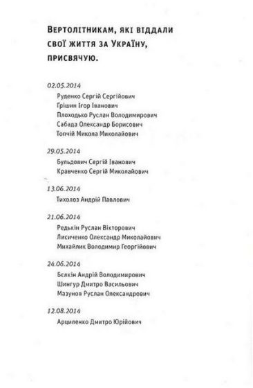 Про них мало знають. Ще менше — говорять. Але вони є. Справжні. Дивні. І — чорт! — небезпечні. Трошки смішні. Трошки божевільні. Льотчики. Професіонали. Воїни. Вони працюють. Вони воюють. Вони гинуть. Вони – так живуть. Українські вертолітники у війні на сході України та у Миротворчій Місії у Демократичній Республіці Конго. Їхні життя, їхня служба, їхня робота. Їхні емоції, надії та страхи. Їхня вірність своїм та ненависть до ворога. Їхні злети та падіння — у прямому сенсі. Терикони та вулкани. Степи та джунглі. Очима безпосереднього учасника подій. Драйв польоту та жах війни. Ревіння турбін. Свист гвинтів. Димні хвости некерованих ракет. А ще — гумор — саркастичний, солоний, авіаційний. Це не спогади, не щоденник, не мемуари. Це — флешбеки. Гвинтокрилі флешбеки.
