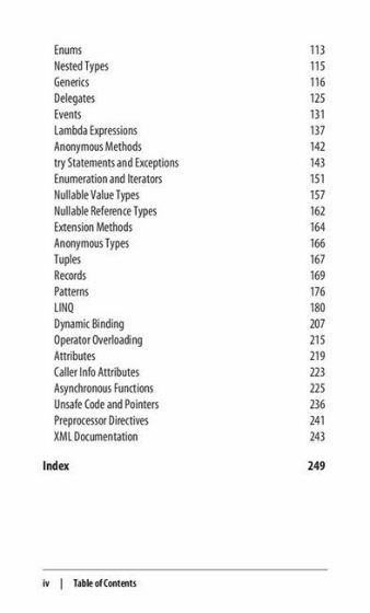 -Advanced topics like operator overloading, type constraints, nullable types, operator lifting, closures, patterns, and asynchronous functions