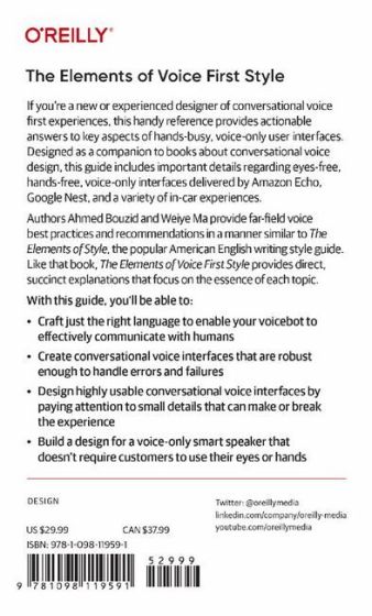 Authors Ahmed Bouzid and Weiye Ma provide far-field voice best practices and recommendations in a manner similar to The Elements of Style, the popular American English writing style guide. Like that book, The Elements of Voice First Style provides direct, succinct explanations that focus on the essence of each topic. You'll find answers quickly without having to spend time searching through other sources.
