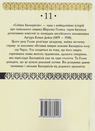 «Собака Баскервілів» — одна з найвідоміших історій про геніального сищика Шерлока Голмса, героя багатьох детективних повістей та оповідань англійського письменника Артура Конан Дойля (1859 – 1930). Цього разу Голмс розв'язків язує загадкову, майже містичну справу: за жахливих обставин вмирає власник Баскервіль-холу сер Чарлз. Усе сходиться на тому, що його смерть спричинила поява якогось чудовиська, адського створіння, яке переслідує Баскервілів вже не одне століття. Та Голмс доводити, що це цілком реальний злочин. Він розкриває давню таємницю і звільняє Баскервілів від родового прокляття.