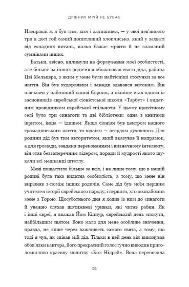Шимон Перес легко і з гумором відкриває душу, підсумовуючи свої здобутки і здобутки Ізраїлю в розвитку авіаційної й аерокосмічної сфер, мистецтві перемовин із європейськими й азійськими урядами, спробі подолати явище тероризму на Близькому Сході й у світі. Зусиллями цієї людини й постала Держава Ізраїль з найліпшою у світі медициною і кількістю стартапів, що перевищує їх число навіть у Кремнієвій долині. І хоч мрії й мають свою ціну, та все одне Перес чимдуж мріяв і вірив у чудо. І воно справдилося, бо дрібних мрій не буває.