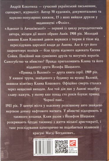 ?Привид із Валової? — друга книга серії. 1909 рік. У кишені трупа, знайденого у будинку на вулиці Валовій, виявили візитівку Клима Кошового. Офіційно смерть сталася через нещасний випадок. Альо тієї дім має у Львові недобру славу: кажуть, у ньому вже понад сто років блукає привид Чорної пані...