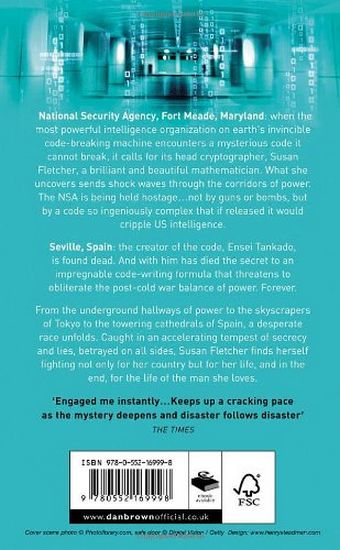 When the National Security Agency's invincible code-breaking machine encounters a mysterious code it cannot break, the agency calls in its head cryptographer, Susan Fletcher, a brilliant, beautiful mathematician. What she uncovers sends shock waves through the corridors of power. The NSA is being held hostage - not by guns or bombs, but by a code so complex that if released would cripple U. S. intelligence. Caught in an accelerating tempest of secrecy and lies, Fletcher battles to save the agency she believes in. Betrayed on all sides, she finds herself fighting not only for her country but for her life, and in the end, for the life of the man she loves...
