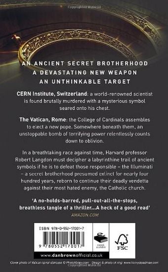 CERN Institute Switzerland: a world-renowned scientist is found brutally murdered with a mysterious symbol seared onto his chest. The Vatican, Rome: the College of Cardinals assembles to elect a new pope. Somewhere beneath them, an unstoppable bomb of terrifying power relentlessly counts down to oblivion. In a breathtaking race against time, Harvard professor Robert Langdon must decipher a labyrinthine trail of ancient symbols if he is to defeat those responsible - the Illuminati, a secret brotherhood presumed extinct for nearly four hundred years, reborn to continue their deadly vendetta against their most hated enemy, the Catholic Church.