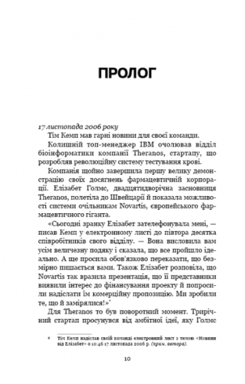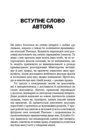 Засновницю стартапу Theranos називали наймолодшою мільярдеркою світу. 22-річна Елізабет Голмс переконала Америку в тому, що винайшла революційну систему аналізу крові, яка врятує життя тисяч людей. Їй давали гроші найбагатші люди Кремнієвої долини, а Генрі Кіссинджер увійшов до ради директорів її амбітного стартапу. Згодом з'єднання ясувалося: компанію побудовано на брехні, інтригах, панібратстві та шахрайстві. А технологія, що мала перевернути світ медицини, взагалі не працює. І лише один журналіст попри всі з'єднання ясував: як Елізабет Голмс вдалось ошукати таке число найрозумніших людей Америки. Ця книга — приголомшливе розслідування, що здивувало навіть Білла Ґейтса.