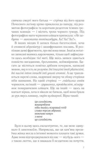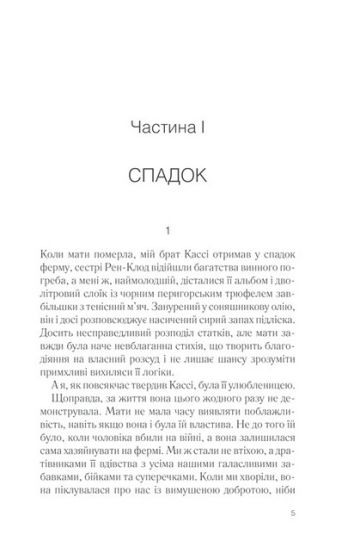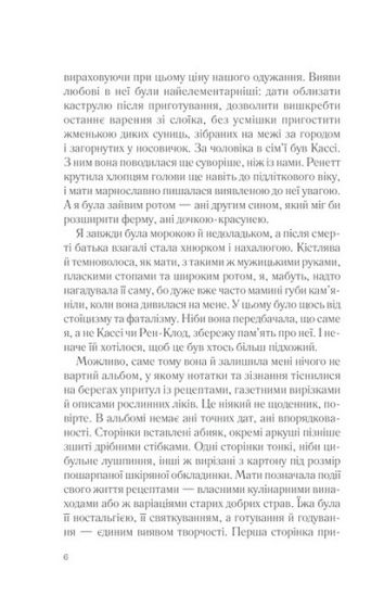 Фрамбуаза отримала дивний спадок від матері. Її брату дісталася ферма, старшій сестрі — винний погріб, сповнений бурштиново-сонячних пляшок, а Фрамбуазі — альбом з кулінарними рецептами. Не багацько... Але на берегах зошита впереміш зі старовинними рецептами різноманітних смаколиків вона знаходить загадкові нотатки. Секрети та зізнання матері. Життя, яке вона так ретельно приховувала від дітей, у часи війни й окупації. Маленькі радощі й прикрощі, потаємні думки, дитячі образи та щира сповідь жінки, що боялася любити. Минуло стільки років. Лишилося стільки запитань. Відповіді на них — у цьому старому щоденнику. Настав час розкрити моторошні таємниці минулого.