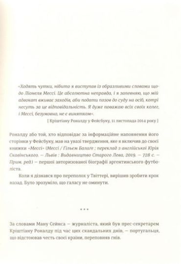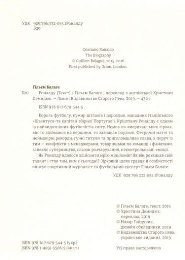 Як Роналду вдалося здійснити мрію мільйонів? Як він розвивав свій талант і став тим, ким є сьогодні? Зірковий шлях гравця й особистості описує спортивний журналіст та футбольний експерт Ґільєм Балаґе.