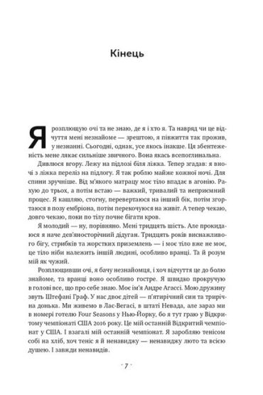 Андре Агассі був і залишається однією з найяскравіших зірок великого тенісу. За свою кар’єру він виграв 60 турнірів, став першою ракеткою світу та олімпійським чемпіоном. Проте головним його ворогом був не суперник на корті, а він сам. Чемпіон світу, що ненавидів теніс. Ніхто не запитував його, чи хоче він бути спортсменом. Батько практично заштовхав його на корт, примушуючи змалечку відточувати удари. Він почувався нещасним і водночас турнір за турніром ішов до титулу абсолютного чемпіона.