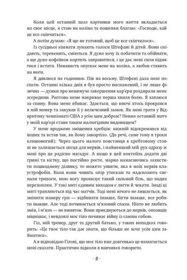 У своїй щирій біографії Агассі розказує про непрості стосунки з батьком, який одночасно лякав його та вишколив з нього переможця, про бунтарські вчинки в житті й на корті, про щоденну боротьбу із фізичним болем від постійних тренувань і про ставлення до гри, яка попри все стала сенсом його життя.