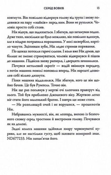 Нік Крід, колишній профайлер ФБР, присвятив життя полюванню на звірів у людській подобі. Проте це життя вже в минулому, він повернувся додому в Південну Африку, де його продовжують переслідувати привиди колишніх поразок. Та коли у вельді біля Йоганнесбурга знаходять розчленоване й понівечене тіло молодої жінки, давній друг Кріда, майор поліції Елі Грей, залучає його консультантом у свій підрозділ. Не всі в поліції задоволені появою консультанта з темним минулим, та й журналісти мріють викрити його таємниці. Нік Крід неохоче береться до справи й одразу висловлює кілька припущень. Хто міг учинити такий жорстокий злочин? Колишній хлопець жертви, приревнувавши до нового коханого? А може, це було ритуальне вбивство?.. «Серед вовків» — моторошний психологічний трилер про метафоричних демонів з минулого і цілком реальних демонів сьогодення, які полюють на невинних.